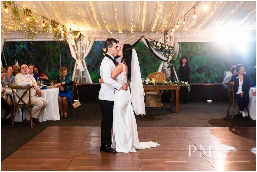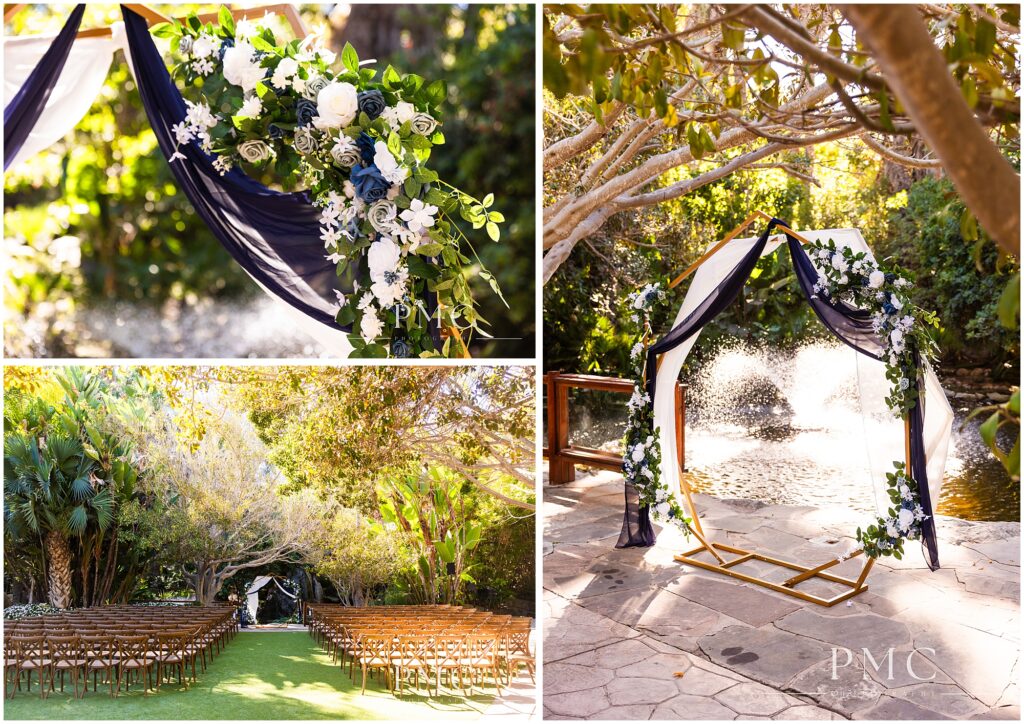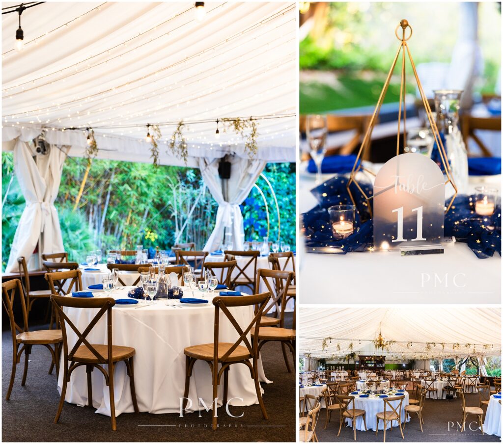 The wedding décor balanced romance and structure beautifully. A geometric arch draped in navy and white fabric sat beside a lily pond, framed by florals in ivory, soft blue, and greenery. Under the reception tent, string lights, greenery, and a chandelier created an intimate glow. The celestial-inspired details reflected Sarah and Bernardo’s love for clean design and subtle whimsy.